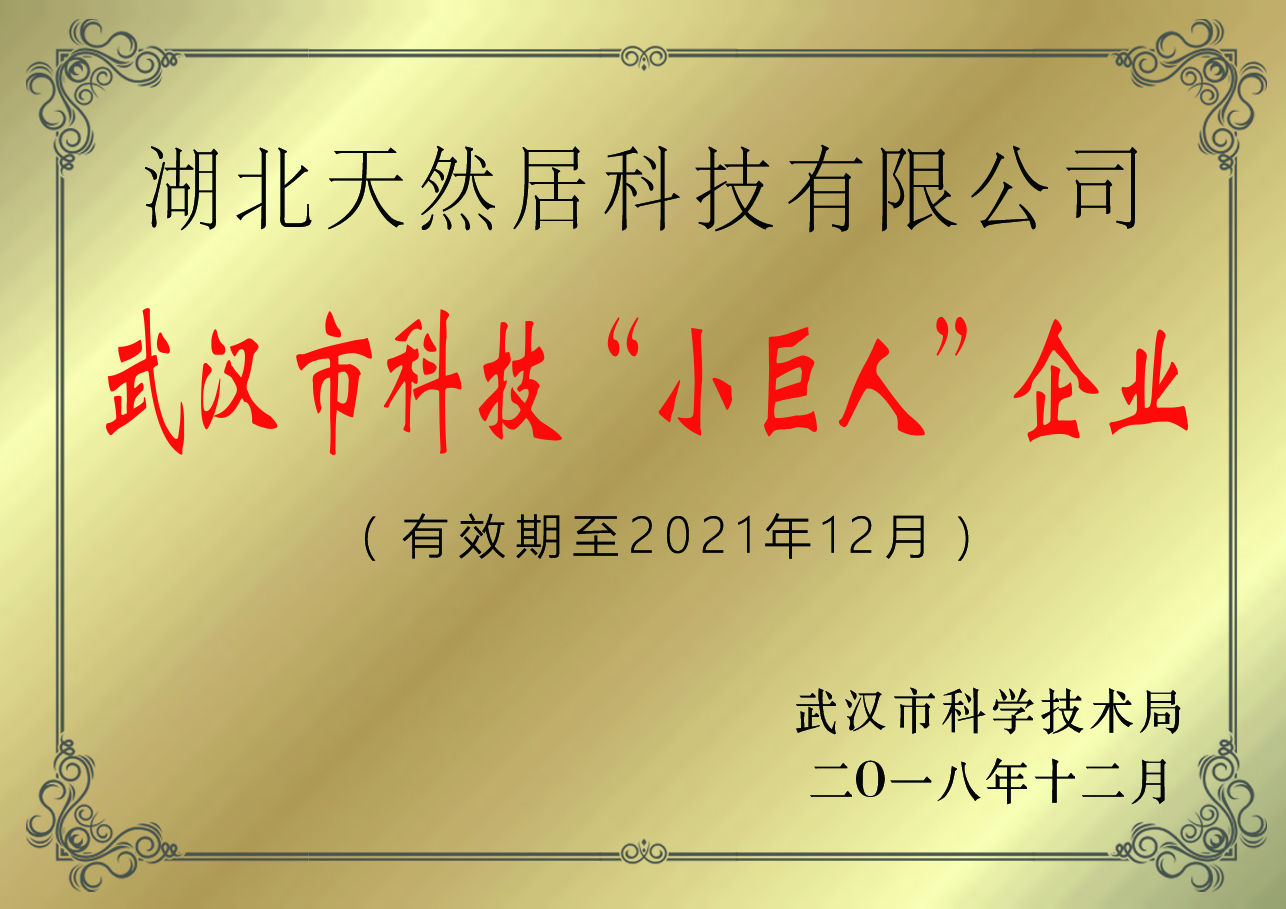 熱烈祝賀湖北天然居科技有限公司榮獲武漢市科技小巨人企業。榮獲此稱號也標志著武漢市科技局對湖北天然居科技有限公司作為高新技術企業的高度認可。